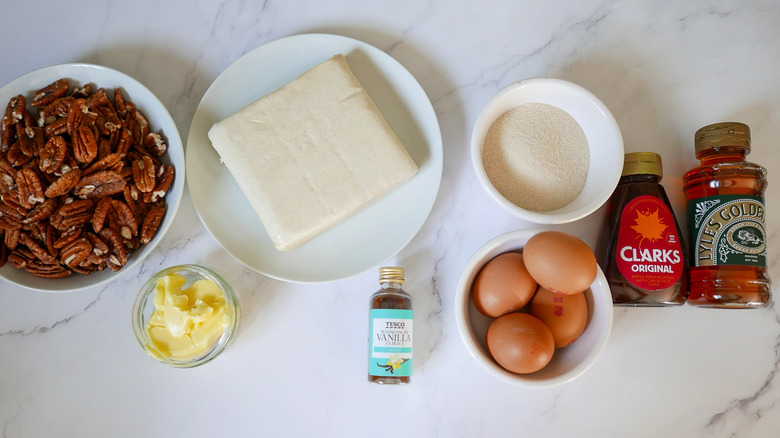 For this recipe, you will only need a handful of items. Be sure to pick up a package of shortcrust pie crust, butter (remember to let it soften before using), granulated sugar, maple syrup, golden syrup, eggs, vanilla extract, and pecans.