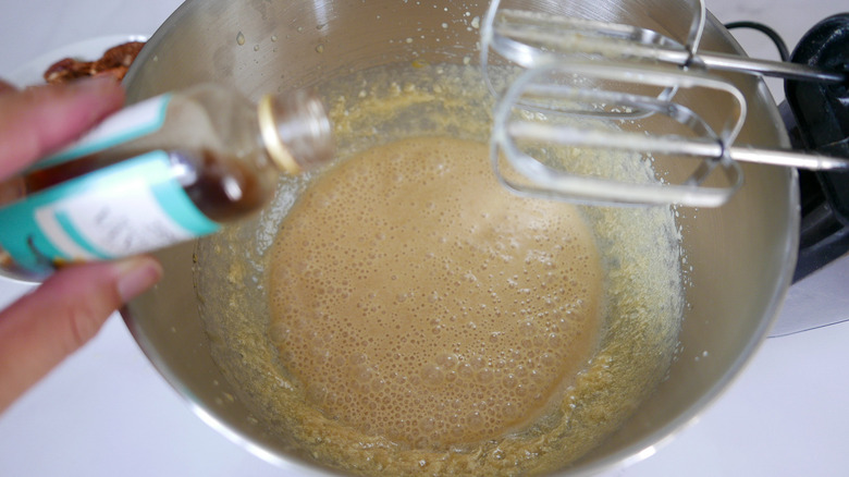 - In a large bowl, whisk the butter and sugar together with an electric beater until light and fluffy. Keep the beaters going, and pour in both syrups. Gradually add the eggs and the vanilla, and keep whisking until combined.