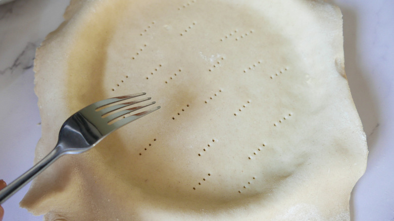 - On a lightly floured surface, roll out the pie crust. Line the prepped pie tin with the pastry. Prick the bottom of the crust with a fork.