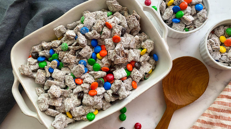 One great thing about this recipe is how customizable it is. Hahn notes that "since there are so many fun themed colored M&Ms, you can have fun making this themed for the particular holiday" you happen to be celebrating. In lieu of colorful M&Ms, though, she says "You can really get creative and add any type of candy to muddy buddies." Among the suggestions she lists are red hots and Reese's peanut butter cups (these would need to be chopped, of course), or you could go in a more savory direction by adding broken pretzel pieces or nuts.