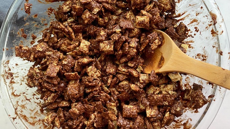 If you're not a connoisseur of Midwestern snack foods, there's a chance you may be unfamiliar with muddy buddies, but you could well know the dish under one of its many aliases such as puppy chow, monkey munch, or the oh-so-appetizing reindeer poop. All of these names refer to the treat's rather unassuming appearance, but it's been a staple of kids' parties and holiday gift baggies for many years due to its sheer simplicity. In fact, as recipe developer Miriam Hahn remarks, her homestyle muddy buddies recipe can be a "fun project to do with the kids."