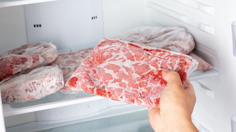 Freezer burn sounds dramatic, but the name is not technically accurate as there's no actual burning involved. According to WebMD, freezer burn happens when meats and other foods placed in the freezer for too long begin to lose their moisture, through sublimation — the process by which crystals turn into gaseous form and move to the chilliest parts of your freezer (via Healthline). This will cause the meat to change color and reduce in size in addition to a heavy build-up of ice crystals on the surface of your meat. Freezer-burned meat will also appear different when thawed and will most likely lose its taste. Although it does change the quality of the meat, safety-wise there's really nothing to worry about. Freezer-burned meat is technically safe to consume, if significantly worse-tasting.