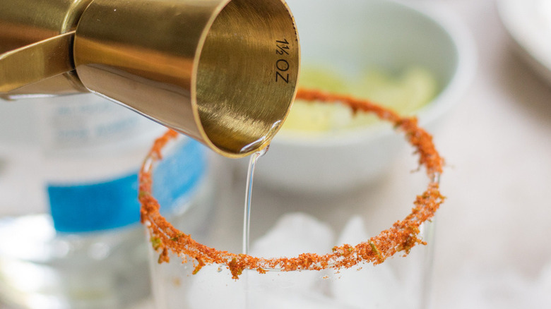 With the spiced rims ready to go, you can focus on building the cocktails. Fill each glass about halfway with ice, then pour 3 ounces of tequila into each, followed by 1 ½ ounces of lime juice. Finally, top each glass off with some Topo Chico and stir it all up.