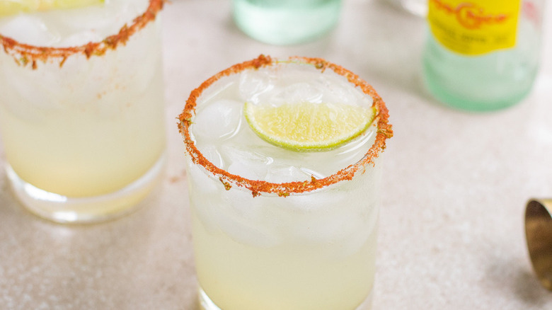 Ah, a ranch water — one of the most refreshing cocktails, without a doubt, and also one that is quite easy to make. No, you won't be mixing together Hidden Valley ranch and water in this recipe, as the name might deceivingly suggest. Instead, you'll combine tequila, lime juice, and the always-crispy-and-refreshing Topo Chico to create a no-frills, understated cocktail that relies on simplicity to achieve its greatness. Okay, maybe there's one frill in this rendition, as recipe developer Jaime Shelbert has graced us with a spiced ranch water recipe, which incorporates "a fun chili-lime spiced rim," as she describes it.