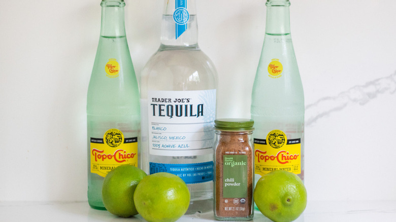 As we've already covered, the boozy element of this cocktail is tequila, which you'll combine with Topo Chico mineral water and fresh lime juice. For the spiced rim, you'll need a lime wedge, lime zest, chili powder, and some salt.