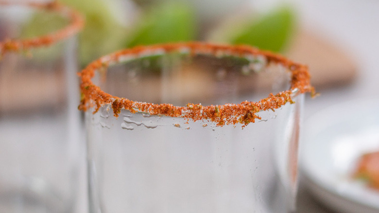 On a small plate, add the lime zest, chili powder, and salt, then mix these ingredients together. Next, grab a lime wedge and run it along the edge of the two cocktail glasses you'll be using. Then, circle the wet rims in the chili powder mixture, ensuring that the entire rim of each glass is evenly coated in the spice blend.