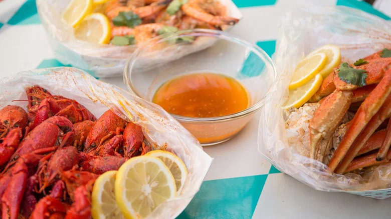 Anyone who's attended an old-fashioned seafood boil knows how fun this eating event can be: Typically, a big ol' pot full of seafood such as shrimp or crab, plus vegetables such as corn or potatoes, is boiled with aromatics, dumped out onto a serving platter or newspaper, and eaten family style — often with no utensils, just your hands (via Serious Eats). Our quick and easy version features snow crab legs, extra-jumbo shrimp, and crayfish boiled with bay leaves and plenty of butter, then drained and tossed in a lemony butter sauce flavored with iconic Old Bay seasoning and crushed garlic.