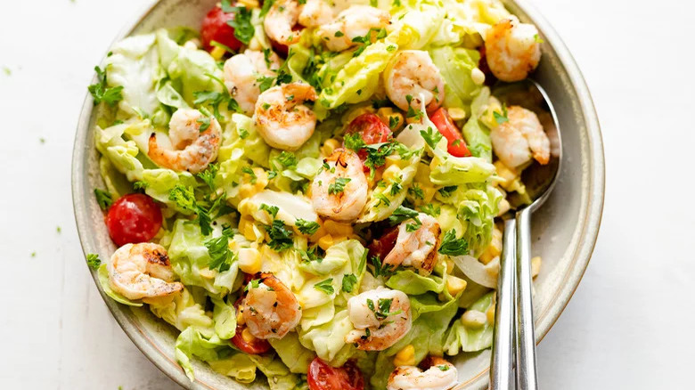 This bright, flavorful summertime salad is the perfect option for the seafood lovers among us. In it, shrimp is marinated in olive oil, lemon juice, garlic, and parsley before being quickly seared. Meanwhile, raw sweet corn, cherry tomatoes, and lettuce are tossed with a creamy, lemony dressing. To bring both parts together, the grilled shrimp are simply spooned over the cool salad. Once garnished with fresh parsley, the dish is ready to go.