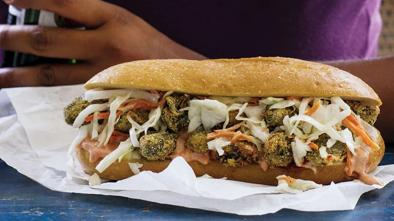 If you've visited the vibrant city of New Orleans, then you've undoubtedly sampled one of the Big Easy's most iconic gastronomic delights: The po'boy sandwich. Essentially a loaded submarine sandwich of a protein such as roast beef or fried seafood that's topped with shredded lettuce, sliced tomatoes, sliced pickles, or other veggies (via NewOrleans.com), po'boys are a Louisiana staple. This homemade po'boy brings a taste of NOLA right into your kitchen, breading canned oysters in a flavorful cornmeal crust, piling them onto soft rolls, and heaping them with tangy homemade cabbage coleslaw.