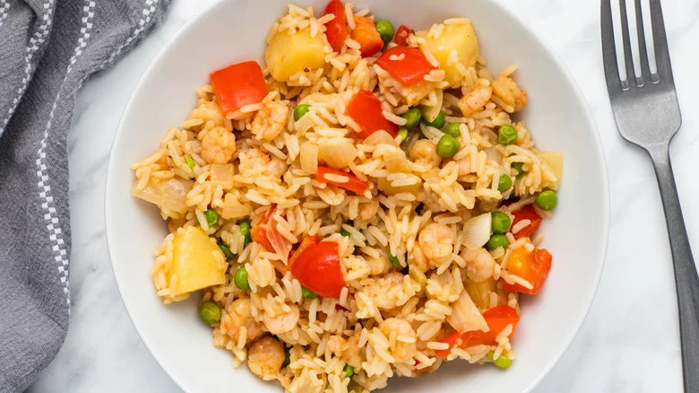 This tasty sweet-and-sour fried rice calls upon the tropical flavors of shrimp and pineapple to create a colorful, well-balanced entrée that's sure to be a crowd-pleaser. To make it, onions, red bell pepper, and garlic are sautéed with shrimp before rice, peas, and canned pineapple chunks (along with their juice) are added and cooked through. Vegetable broth and some soy sauce lend a savory quality, and best of all, the whole dish takes just 15 minutes to prepare.
