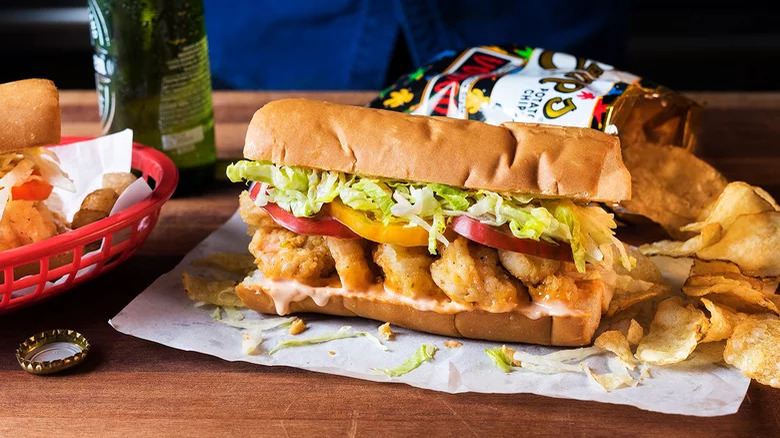 If you've got a craving for New Orleans food but are a bit too short on time or money to get down to the Big Easy, why not bring the flavors of NOLA into your kitchen with this iconic shrimp po'boy? To make it, buttermilk-marinated shrimp are dredged in a flavorful cornmeal crust and then fried until crispy. Then, soft rolls are spread with hot sauce mayo, the shrimp are piled on, and topped with sliced tomatoes, shredded lettuce, and sliced cornichons. It's a classic execution of a classic dish, and we don't think you'll be able to resist it.