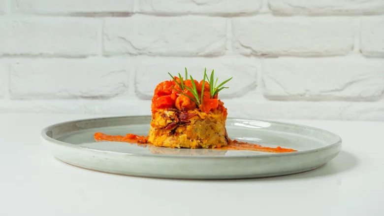 Have you ever heard of mofongo? A twist on the African dish fufú, which eventually made its way to Puerto Rico and the Dominican Republic, mofongo utilizes sweet plantains in place of the original pounded yams or cassava root. This version fries the plantains in oil until they're soft and sticky, then mashes them with crumbled bacon, butter, rosemary, and garlic powder. Next, a flavorful sauté of shrimp, tomatoes, and bell peppers is cooked together before being finished with a squeeze of fresh lemon. The bright, vibrant shrimp stew is then served over a portion of the plantain mash, making for a colorful Caribbean dish that pairs perfectly with a simple green salad.