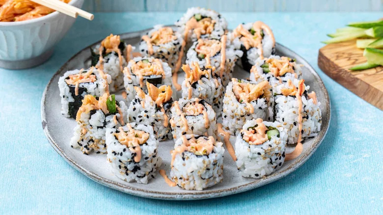 Homemade sushi might not always come out resembling the picture-perfect rolls served up by your favorite Japanese spot, but it will certainly be tasty. That's reason enough to ditch the takeout menu, grab your bamboo sushi-rolling mat, and whip up some of these spicy crab salad rolls, made using the imitation crab meat known as surimi. Bound with Sriracha mayo, the surimi is rolled into nori and sushi rice along with black sesame seeds and cucumber sticks, sliced, and served with additional spicy mayo.