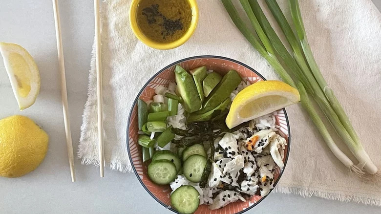 If you want to "eat sushi without all the work" of making it at home, then this sushi-inspired bowl is the way to go, according to recipe developer Jason Goldstein. The dish features sushi rice that's elegantly adorned with cooked crab meat, sliced cucumber and avocado, roasted seaweed, and chopped scallions. Then, the loaded bowl is drizzled with a flavorful dressing of ginger, garlic, Dijon mustard, soy sauce, apple cider vinegar, lime juice, and olive oil, and garnished with black sesame seeds before being served.