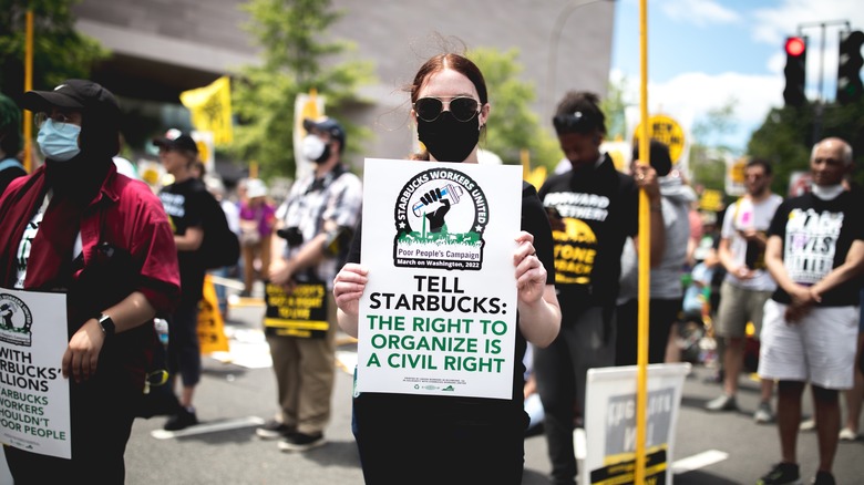 In the newest chapter of Starbucks' long and tumultuous unionization saga, the coffee giant is being sued for wrongful termination — again. In August 2022, Starbucks was court-ordered to reinstate a group of workers known as the "Memphis Seven" after firing them in February for pro-union efforts (via The Hill). This time, however, the plaintiff is New York City.