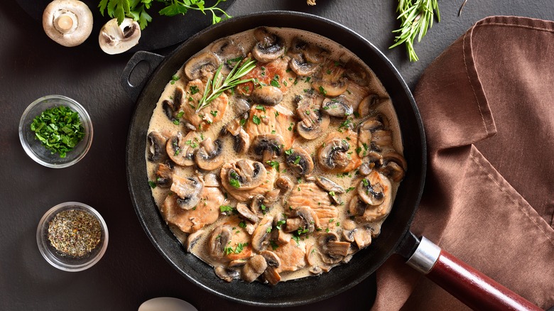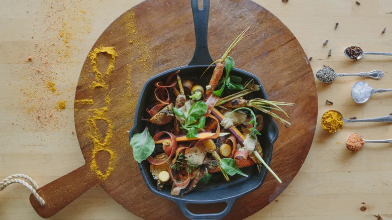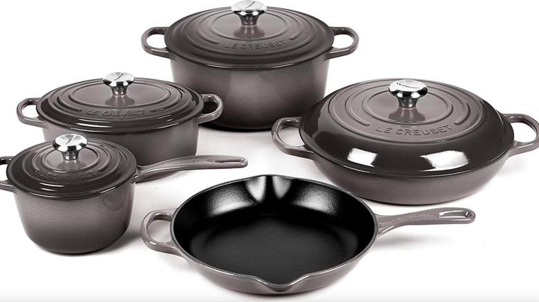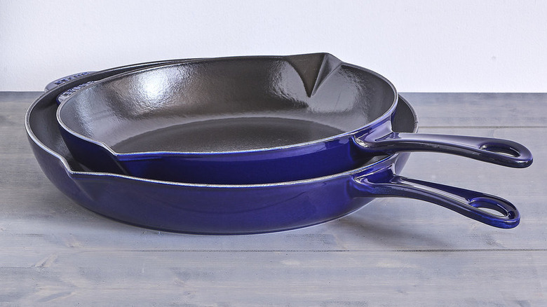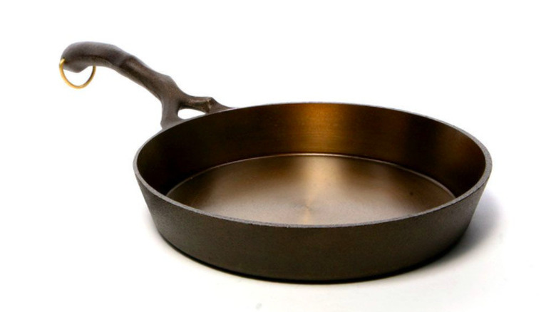 Le Creuset may be the peak of designer cookware. Although the brand is famous for making some of the most beautiful cast-iron Dutch ovens, the brand also includes several cast iron pieces. According to Viva Flavor, the signature skillet is top-of-the-line when it comes to aesthetics and design. While enameled cast-iron isn't truly non-stick, it offers a cooking experience similar to that of a non-stick pan. The signature skillet is durable, evenly heats food (unlike other cast iron skillets), and will retain its color over time thanks to high-quality pigments. The price tag is likely the only thing stopping you from ordering a La Creuset from Williams Sonoma; its retail value is $160.