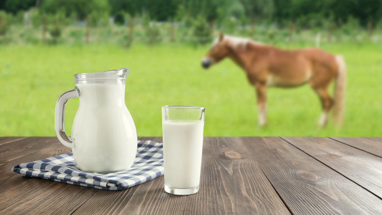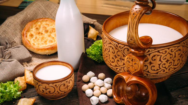 Kumis was the Central-Asian alcoholic bevvy sipped by "infants and Genghis Khan," per Atlas Obscura. It is roughly only 2% ABV. Kumis (aka "airagh") is white, foamy, fermented horse milk with a taste that's been described as "champagne mixed with sour cream." The Botai people were drinking it more than 5,000 years ago. In what is now Kazakhstan, they tamed wild horses and fermented their milk – its naturally high sugar content makes the fermentation process as easy as churning and waiting for alcohol to form, per CalorieBee. The alcohol content comes from lactic acid fermentation. But was the drink really linked to Genghis Khan?