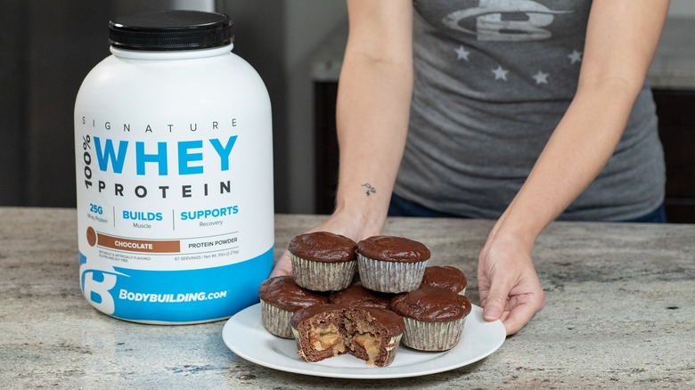 If you find the taste of protein powder to be a bit repulsive (and you're not the only one), try substituting powdered peanut butter for a protein powder with a 1-to-1 ratio. Peanut butter powder is an excellent replacement for protein powder in baking because you won't have to change any of the ratios in the existing recipe to account for a drier batter. If the recipe does not include protein powder, you can consider substituting a small amount of the flour for powdered peanut butter. Mona's Table recommends substituting no more than one-quarter of the flour with protein powder. Be aware though that changing the ingredients in the recipe may result in a different texture or resulting bake; you may have to adjust the moisture levels in the batter or dough to keep the same hydration.