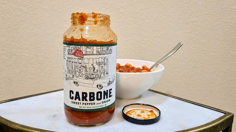 Slow-simmering tomatoes, sweet bell peppers, and savory onions to create a luscious sauce ideal for spooning over anything from pasta to steak or sausages to seafood sounds delicious. The natural sweetness of each ingredient becomes amplified during the slow cooking process. And, while the idea of sausage with bell pepper pasta sounds delicious, or using pepper and onion sauce as an option for meatballs instead of marinara, I suggest skipping Carbone's Sweet Pepper and Onion sauce to make it. This one didn't wow me like some of the other options did from start to finish.