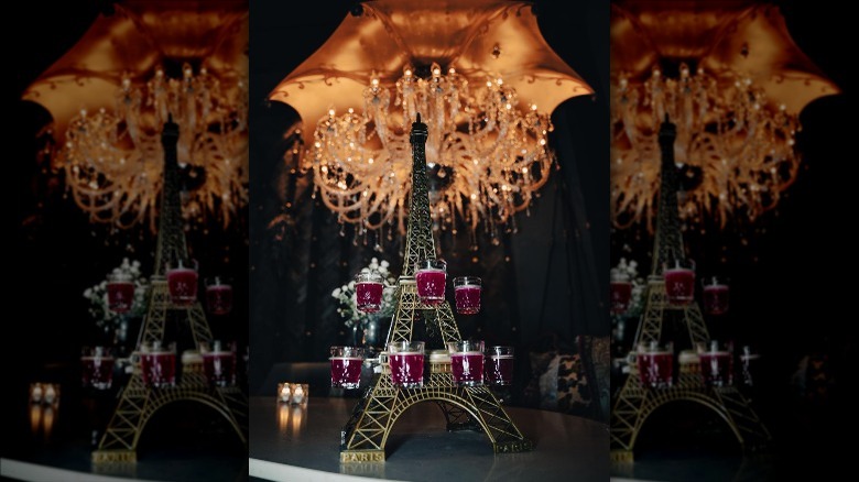 But the centerpiece of the restaurant's food and drink options is arguably The Eiffel Tower. Located on its drink menu, guests who place an order for The Eiffel Tower are treated to 12 shots of their choice from Vanderpump à Paris' à La Carte's unique shot selection — which includes blueberry vodka and peach whiskey among others. And, according to Delish, the name of this drink isn't just for show. Your alcohol will be served up in a perfect miniature recreation of the Eiffel Tower.