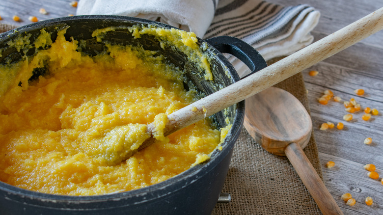 Bon Appétit notes that not all types of cornmeal are created equal. Grits are a more coarsely ground cornmeal, while traditional polenta is a bit finer, but it's also made from flint corn that holds its shape a bit better when being cooked. Grits, which come from dent corn, are softer and more likely to lose their shape when cooking. For this reason, it's also important to use the type of polenta that your recipe calls for to get the creamiest outcome.