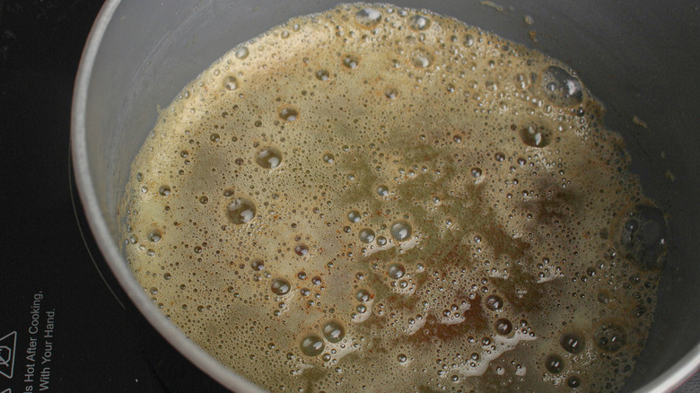 With the butter melted down, go ahead and pour in the hot sauce. Stir it all together and let the sauce cook for 2 to 3 minutes, and be wary of overdoing it. "Be careful not to overcook the sauce, as you don't want the butter to start burning," Olayinka shares.