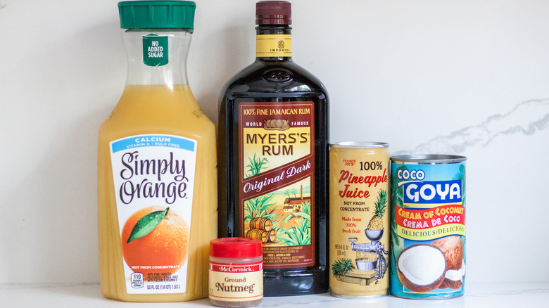 To make this tropical treat, all you need are five, easy-to-source ingredients. Make sure you have pineapple juice, dark rum, orange juice, cream of coconut (make sure it's stirred well before you use it!), and nutmeg. And while it's optional, if you're really looking to harness the tropical vibe, pick up a pineapple to use for garnishing your cocktail glasses.