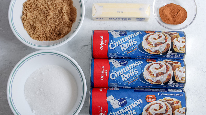 In addition to the rolls and their icing packets you'll need white sugar, brown sugar, butter, and cinnamon. Morone adds that "you could definitely switch up this recipe by adding chopped nuts," suggesting that you stir these into the brown sugar/butter mixture.