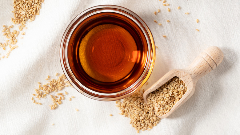 Sesame oil is used in various dishes, especially Chinese, Japanese, and Middle Eastern cuisine, per WebMD. The distinct flavor and aroma lends itself to the dishes as an additional flavor profile rather than just a frying oil. Whether it's kung pao chicken, seared tuna, or an appetizer of hummus, sesame oil can be found in many of our favorite takeout dishes.