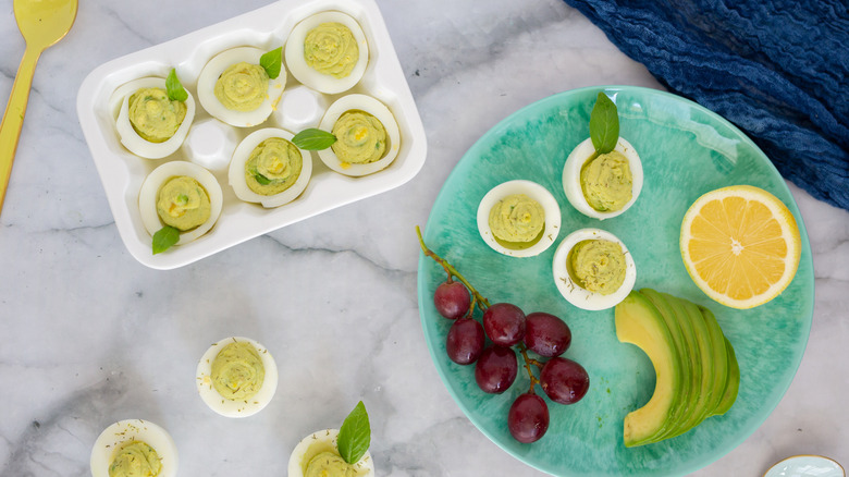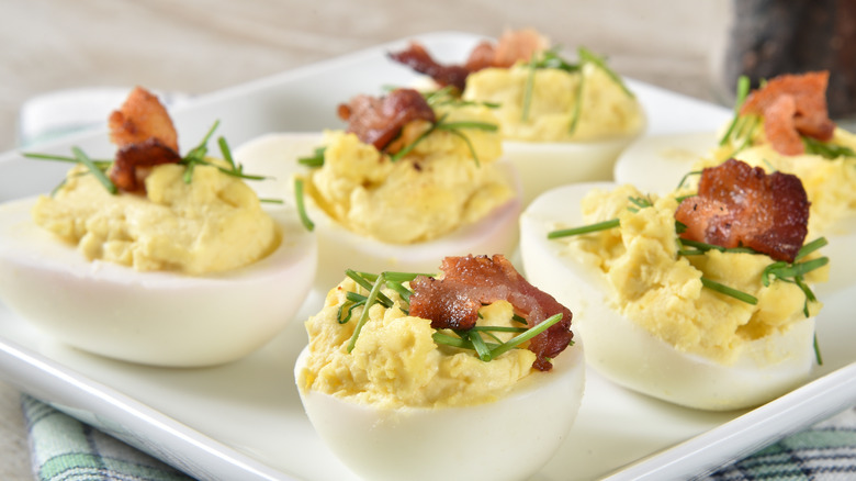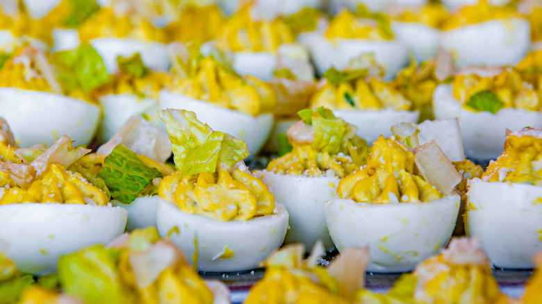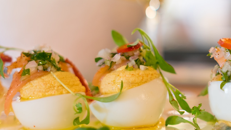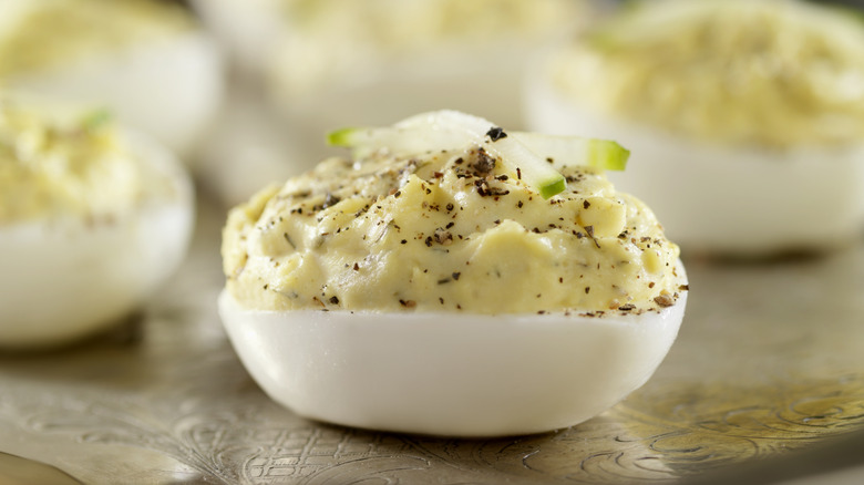 The firm-boiled egg whites graciously hold a rich filling that typically incorporates yolks, mayonnaise, mustard, and more. Sprinkle a bit of paprika on them, and they're good to go, right? Although that is an option, you don't have to make them the same way every time. Boiled eggs are a great canvas because they pair well with so many flavors and ingredients. Whether you are in charge of the appetizers for an upcoming party or just want to expand your horizons, these ingredients will have you questioning why you didn't dress up your deviled eggs sooner.