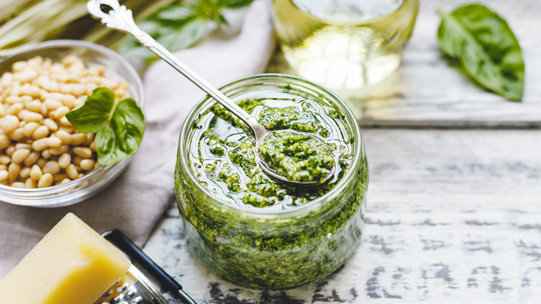 If you want to let your creative side take over, try adding this Italian staple to your deviled eggs. Utilizing basil pesto in the filling will give an herb-like and subtly sweet undertone. You can control the amount depending on how prominent you want the flavor to be. Adding a couple of tablespoons will give the deviled eggs a faint pesto taste while adding a more considerable amount will make it more pronounced. The flavors of fresh herbs, parmesan, and a hint of garlic will pair splendidly with the yolks and other filling ingredients. You could even give the deviled eggs a bit of fresh basil as a garnish.