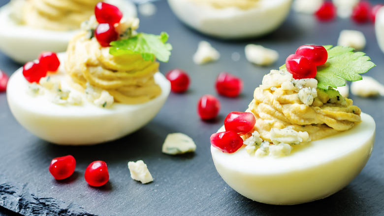 Pomegranate seeds are a well-rounded ingredient because of their sweet and tart balance. They can be tossed in a fresh salad or used as a garnish in a hearty bowl of oatmeal. There are numerous ways to utilize their unique taste to your advantage and using them in deviled eggs is one of them. Your best bet is to bring them into play as a garnish rather than mixing them into the filling; this way, their vibrant color will undoubtedly catch the eye. In addition, the bitter-sweet taste will complement the eggs, especially when paired with fresh herbs. When integrating pomegranate seeds into your deviled eggs, you could even make them festive and turn them into Christmas deviled eggs.