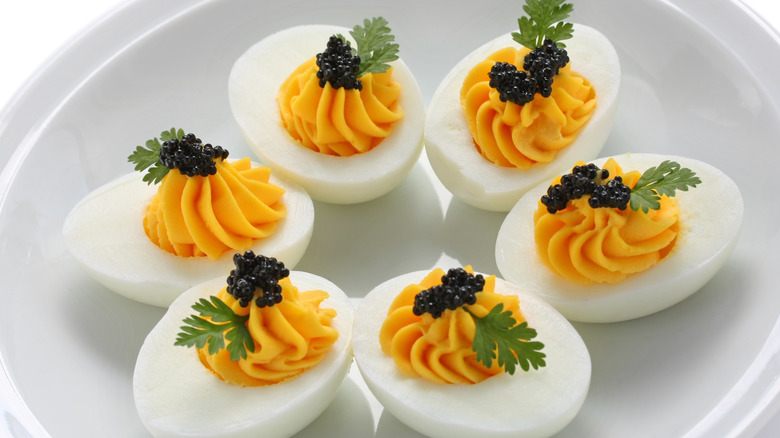 If you are serving deviled eggs for a crowd, you might be wondering how you can dress them up to make them appear more elegant. Of course, there are countless ways to do so, but caviar is the fancy ingredient that will change your deviled eggs forever. Using caviar as a garnish for your deviled eggs will certainly add depth and complexity to the flavor of the appetizer. With its slightly salty and savory taste, this ingredient will have your guests turning heads. Not to mention, the black color of the tasty caviar will stand out against the golden yellow filling, doubling as an embellishment.