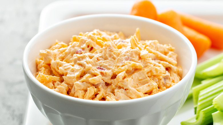 Using pimento cheese is a clever and distinct way to spice up your deviled eggs. With the taste of rich mayonnaise, cheddar cheese, spices, pimentos, and more, pimento cheese has so much to offer. Add this to your deviled eggs, and it becomes even more top-notch. Let's also not forget the special ingredient to take your pimento cheese to the next level: bacon. With all these scrumptious flavors combined, taking a bite into a pimento cheese deviled egg will be a heavenly experience, to say the least. The cheesy filling and crunchy bacon make it hard to put these deviled eggs down.