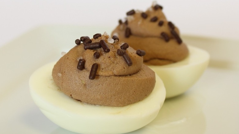 While it may not be for everyone, the Ohio State Fair highlighted a truly unique take on the classic deviled egg. Chocolate deviled eggs are a sweet twist on the traditional appetizer. The hard-boiled egg white shell is stuffed with a decadent mixture of yolks, cream cheese, cocoa powder, and powdered sugar. Taste of Ohio Café offered up this culinary experiment in 2019, proving that there truly is no limit to the possibilities for fun and surprising deviled egg toppings.
