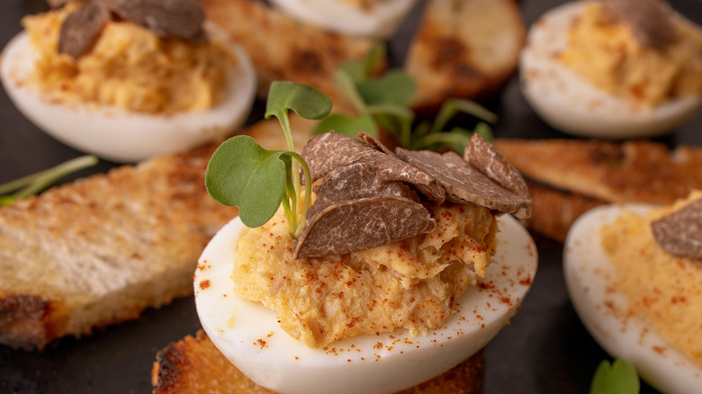 Truffle in deviled eggs? Yes, and it tastes divine. This is the unexpected ingredient Anne Burrell uses in deviled eggs, but she isn't the only one to do so. Putting a dash of truffle oil into the filling will provide an earthy and bold flavor that gives deviled eggs a unique taste you can't replicate by using other ingredients. The greatest thing is that it only takes about a tablespoon for the truffle flavor to shine through. Of course, if you don't have truffle oil, you can always top with deviled eggs with truffle as a garnish. Whichever the case, you won't regret giving your deviled eggs a fancy upgrade with this ingredient.
