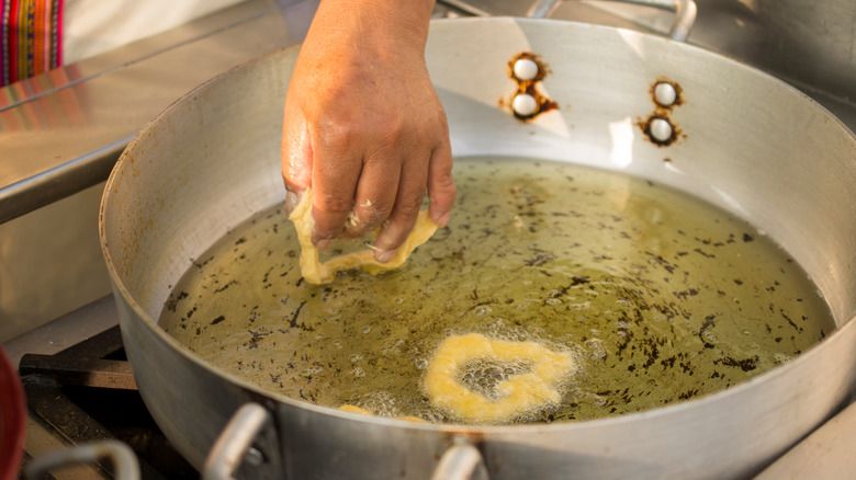 While you let your dough rest, you create your chancaca syrup by combining cinnamon, cloves, orange peels, and chancaca sugar in a pot, per Lima Easy. Once your dough doubles in size, you use wet fingers to gently grab a piece to drop in hot oil. The dough is much more sticky and gloppy than regular doughnut dough, which is why the finished product comes out looking misshapen, like fritters. After you fry them, you drizzle that deeply spiced chancaca sauce on top and enjoy!