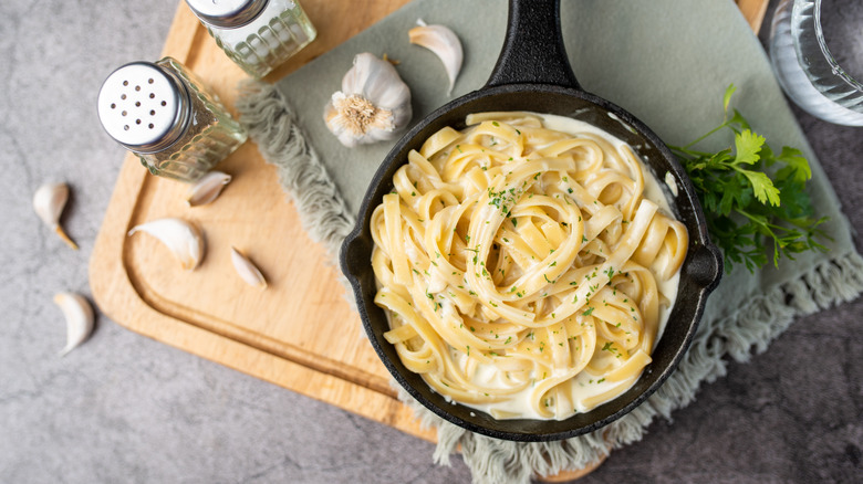 Restaurateur Alfredo Di Lelio invented the simple recipe in 1908 for his pregnant wife who didn't have an appetite for anything else. However, it ended up making waves as a traditional Italian dish when celebrity couple Douglas Fairbanks and Mary Pickford tried it at Di Lelio's restaurant and introduced it to the American press (via Forbes).