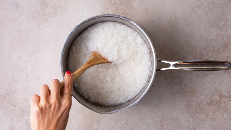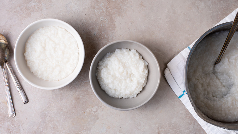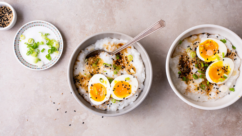 The porridge-like dish can be topped with a wide variety of ingredients, including meat, fish, vegetables, eggs, and kimchi. Sometimes, these additional flavorings are added to the rice itself while it simmers, while other times, they're served atop the rice. In its most basic form though, "congee" simply refers to rice that has been simmered in a large volume of water for a long time.
