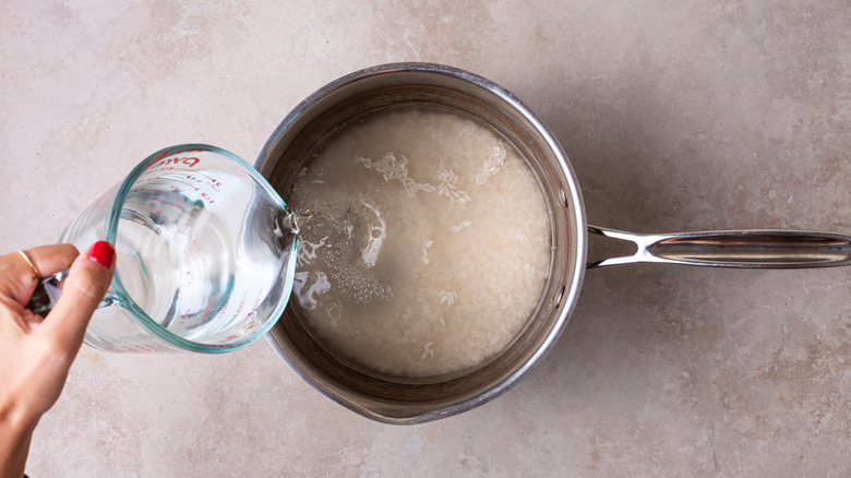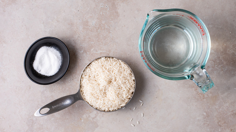 - In a medium-sized pot, combine the rice, water, and salt. Cover and bring to a boil.
