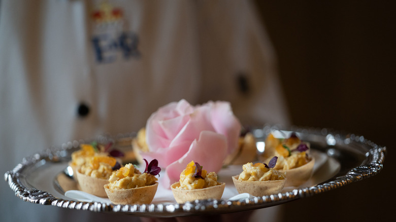 Le Cordon Bleu culinary school student Angela Wood was just 19 years old when the school's director, Constance Spry, entered the kitchen and enlisted her help in perfecting her recipe for the Queen's coronation banquet (via Agence France-Presse). The resulting Coronation Chicken took weeks of work from Wood, who explained she was "forever boiling chickens." The final result: chicken poached with bouquet Garni, in a sauce of onions, curry, tomato, red wine, and lemon juice; later, mayonnaise, whipped cream, and apricot purée are added. Coronation Chicken was served chilled so it could be prepared ahead of time, and it appeared on the menu as "Poulet Reine Elizabeth."