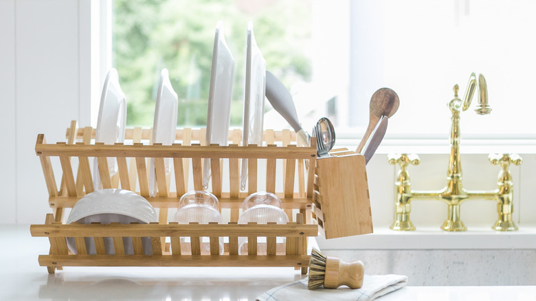 There are a few steps you can take to properly dry your wooden spoons, according to Master Class. First, you need to hand-dry them to ensure they aren't left soaking wet. But, once you're finished wiping off the utensils with a rag, you don't want to put them away in a drawer or leave them flat on your drying rack. Master Class notes that lying a wooden spoon flat when it's still even slightly wet can cause its wood to crack or even expand.