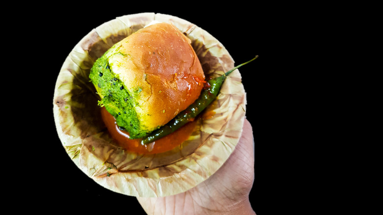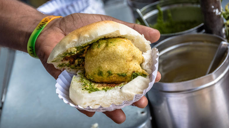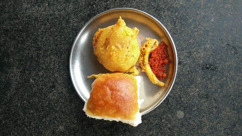 Imagine a crispy fried potato the size of your fist smashed into a toasted white burger bun and you have the general idea of vada pav. And yet, it is so much more. According to Tampa Indian Food, vada is "a category of savoury [sp] fried snacks from India and Sri Lanka." In this case, vada refers to the crispy potato patties, which are often mixed with spices, chiles, and onions before they are dunked into chickpea batter and deep fried to perfection (via Times of India). The reason why the fluffy bakery bun is called pav, however, is a bit hazy. According to the Decan Herald, one theory is that the buns are bought in groups of four, and pav means one-fourth in Marathi.