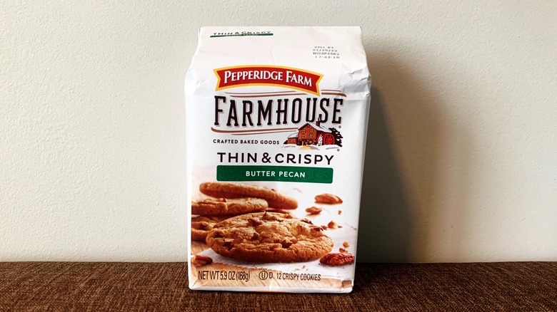 Pepperidge Farm cookies are always baked with no artificial flavor or preservatives, creamery butter, real eggs, and other high-quality ingredients that leave no room for nonsense. This great choice is never more apparent than in the relatively new Farmhouse Thin and Crispy Butter Pecan cookies. The flavor combination is both light and rich, nostalgic and inventive, layered and smooth, fun and dependable. Whether or not you're lucky enough to enjoy these alongside a bowl of slow-churned ice cream, you'll get a happy feeling with just one these carefree cookies all by themselves.