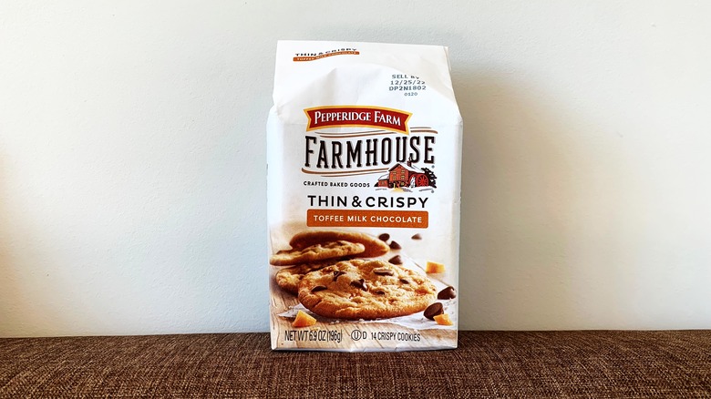 Pepperidge Farm's Farmhouse Thin and Crispy Toffee Milk Chocolate cookies pack a lot of goodness into each piece. Toffee differs from butterscotch and caramel even though all three are sticky, sweet confections that always add complexity and pizzazz to a plain dessert. Toffee is created when sugar and butter cook for a long time — past the point of caramel — reaching a chewy yet brittle consistency that breaks into delicious pieces. In this case, those flavor bombs are tossed with smooth milk chocolate. The yin to its yang.