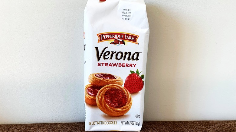 Verona is a stunning, fanciful, ancient city in Italy that apparently inspired this sunny cookie. Strawberry Verona is one of Pepperidge Farm's best, definitely landing in the top tier. These buttery rounds are flakey and fine, not dense, and have a light texture akin to a shortbread cookie. Not too sweet, it's a great nest for a dollop of jewel-like strawberry jam on top. The taste of berries comes through, and again, it's neither too saccharine nor overly fruity. If you're eating a cookie, it should taste like one!