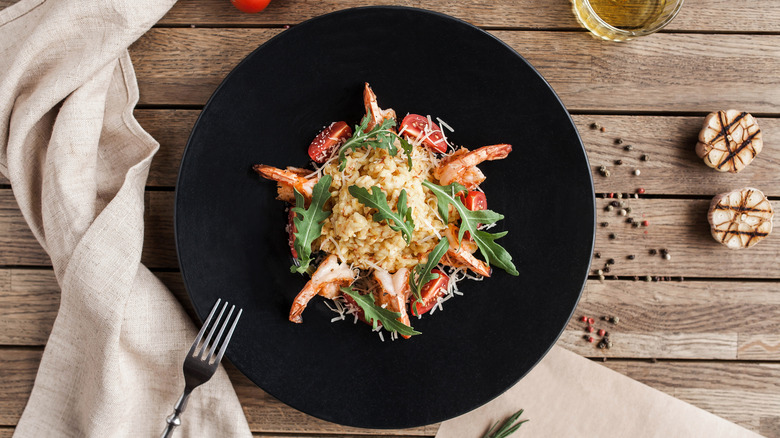 Risotto, according to Food Network, originated in Italy and is made from arborio, a short grain rice, which is cooked with warmed stock that is slowly ladled into the pot multiple times in order to gently turn the rice into a creamy and delicious dish. It's often finished with freshly grated cheese, butter, mushrooms, and herbs.